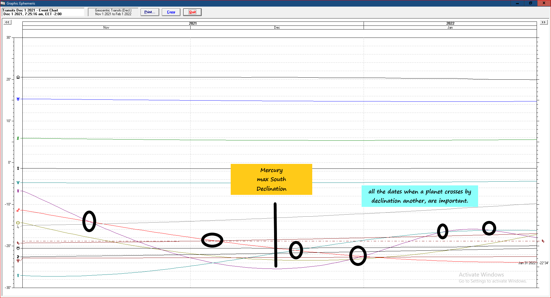 Besides the eclipse we do have another important event in the sky: Mars is conjunct by declination Saturn, something that happens rarely, due to their slow motion. The best to check out when were they in the same position, is to run the declination chart for the last 100 years:Also, please reread my last post in the previous article, about the long affect of Venus in Capricorn, due to its retro motion. Yes, I wrote, that X-mas rally might be cancelled under such planetary positions. I mean, that I don't see higher highs than the historical highs we had till now; doesn't mean the indices cannot go higher from their low level they touched yesterday.