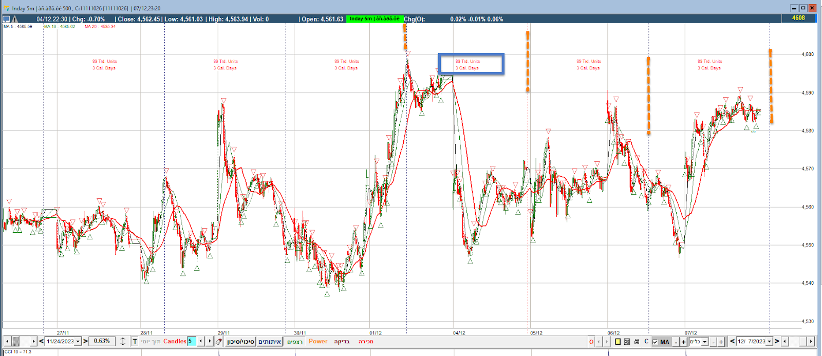 Now here is an interesting thing: the Macro as the Micro: I took the 5 min chart, and 89 trading units.. it shows future reversal times..