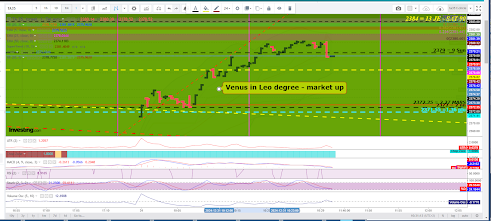 All happened as per the statistics posted yesterday. For today a reversal is expected. So let's look at the numbers and the planets. It is a day ruled by Mars, in opposition Pluto and trine the NNode. Venus is also a co- ruler, and it is at 26♒56; it is a Cancer degree, at 10:15 am it moves into 27*, which is a LEO degree, so I will wait and see if markets will reverse then.