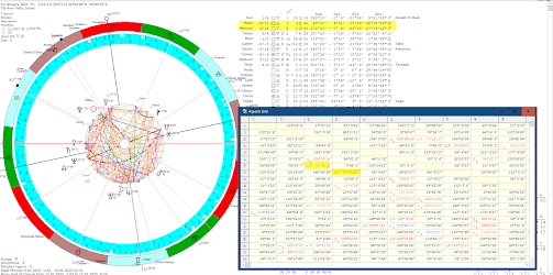 The Moon makes a whole wheel, Mercury Moves out of ♐(from Detriment) to ♒; Venus also moves from ♒to♓; the rest hardly move 1-3 degrees. By the end of the month Uranus will be stationary (strong) before turning Direct.