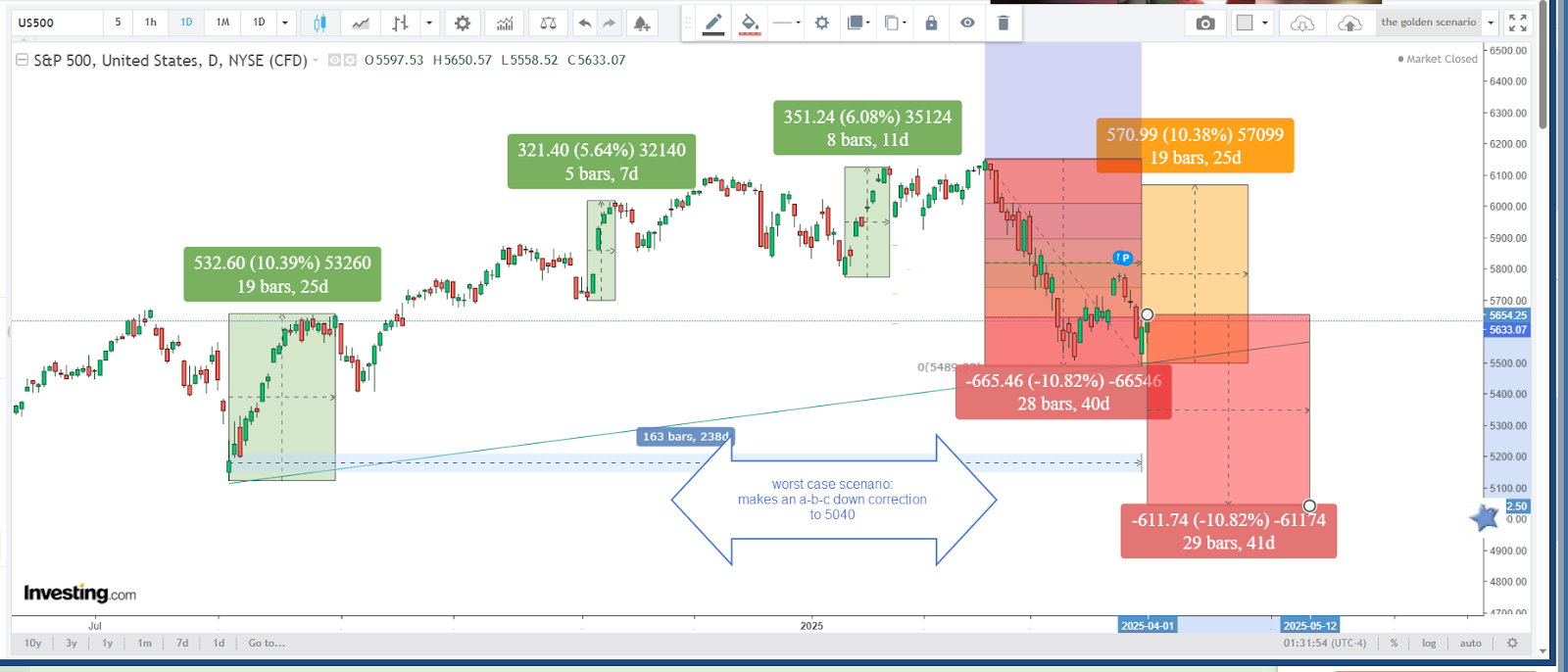 Worst case scenario: makes an a-b-c down correction: to 5040 which was 5/30, 2024 low.